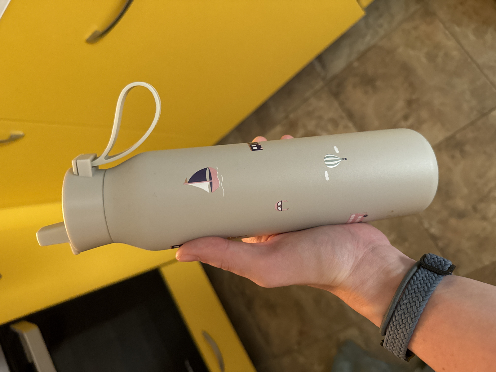 Sticlă de calitate superioară. Design simpatic. Capacul este ușor de deschis. Se curăță ușor. Dimensiunea ideală pentru grădiniță dar și pt activități sportive.