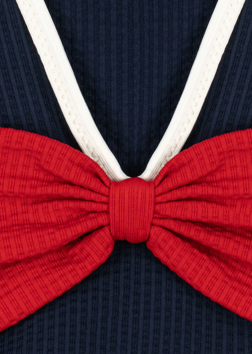 Costum de baie din material seersucker moale, cu bretele subțiri și fundă decorativă la spate. Material elastic, cu uscare rapidă, confortabil de purtat pentru zilele distractive la soare.