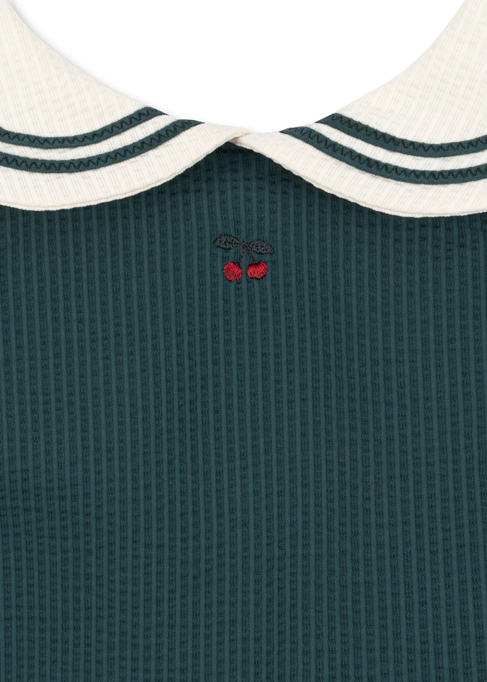 Costum de baie cu guler marinaresc în față și spate în V. Prezintă cireșa emblematică a lui Konges Sløjd pe față.