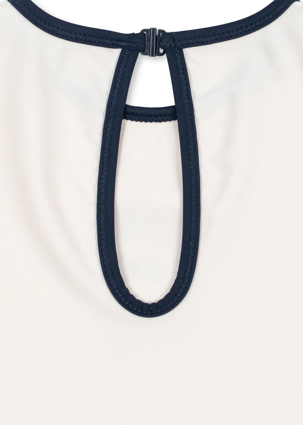 Acest costum de baie este confecționat dintr-un material confortabil și elastic. Conceput cu mâneci lungi pentru protecție suplimentară împotriva razelor UV dăunătoare, este fabricat dintr-un material flexibil, cu uscare rapidă, perfect pentru zilele lungi la plajă sau la piscină.