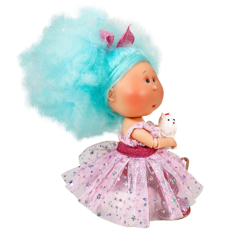 Nines D'Onil Papusa Nines D'Onil, Mia Cotton, cu parul albastru, cu catel, cu articulatii, cu miros de vanilie, 30 cm